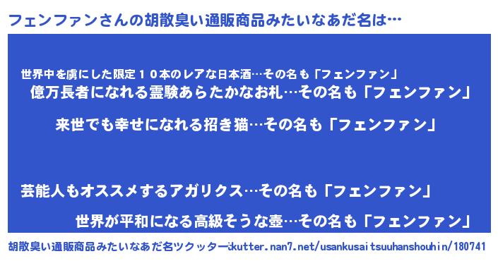 | 男性向けラノベタイトル風あだ名 | 『フェンファンという概念が存在しない退屈な世界 』 |