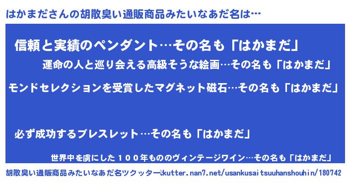 | 男性向けラノベタイトル風あだ名 | 『はかまだに滅ぼされるだけの簡単なお仕事です』 |