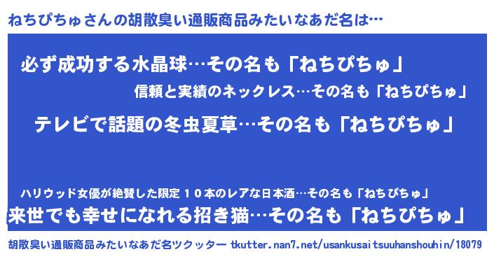 | 男性向けラノベタイトル風あだ名 | 『Re:ねちぴちゅから始める異世界生活』 |