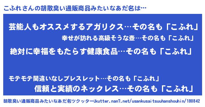 | 男性向けラノベタイトル風あだ名 | 『こふれという概念が存在しない退屈な世界 』 |