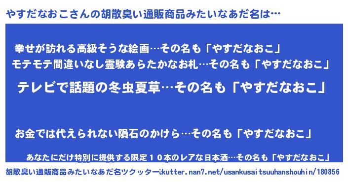 | 男性向けラノベタイトル風あだ名 | 『Re:やすだなおこから始める異世界生活』 |
