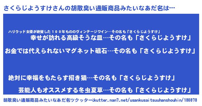 | 男性向けラノベタイトル風あだ名 | 『おまえをオタクにしてやるから、俺をさくらじようすけにしてくれ! 』 |