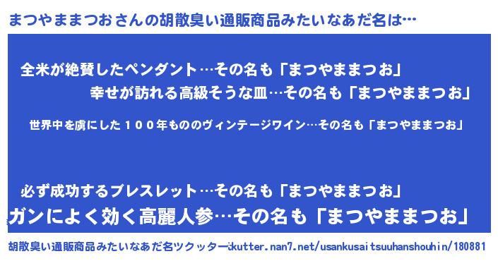 | 男性向けラノベタイトル風あだ名 | 『この素晴らしい世界にまつやままつおを!』 |