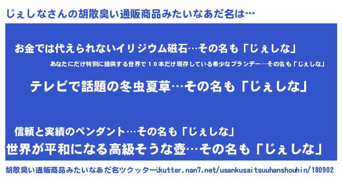 | 男性向けラノベタイトル風あだ名 | 『転生したらじぇしなだった件』 |