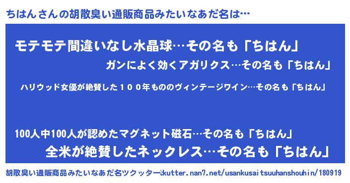| 意味不明あだ名 | 『住所不定無職ちはん(9歳)』『自称ちはん』 |