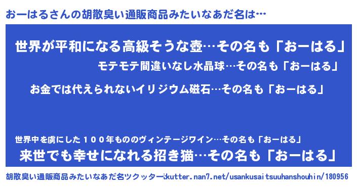 | 男性向けラノベタイトル風あだ名 | 『おまえをオタクにしてやるから、俺をおーはるにしてくれ! 』 |