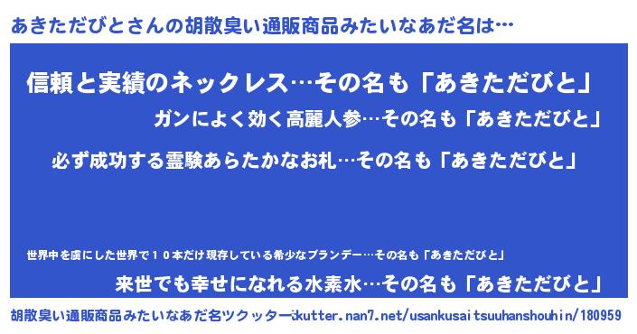 | 男性向けラノベタイトル風あだ名 | 『あきただびとの憂鬱』 |