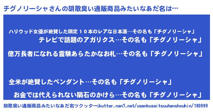 | 男性向けラノベタイトル風あだ名 | 『チグノリーシャアートオンライン』 |