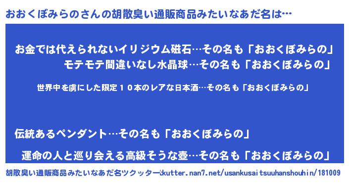 | 意味不明あだ名 | 『住所不定無職おおくぼみらの(40歳)』 |
