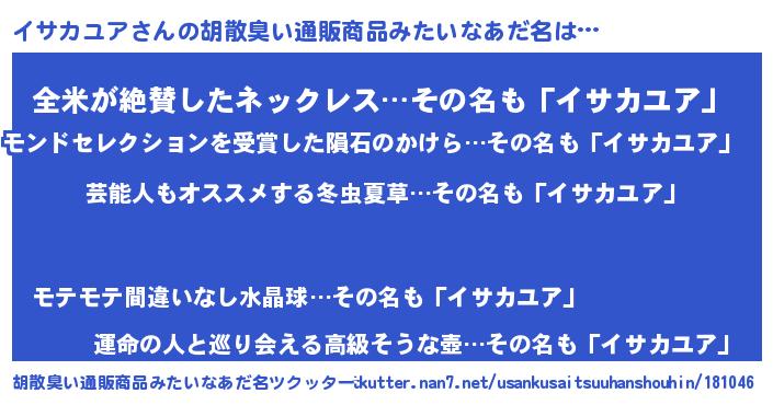 | 恥ずかしいあだ名 | 『イサカユアデラックス』『イサリンリン』 |
