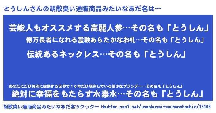 | 男性向けラノベタイトル風あだ名 | 『とうしんの嫁は女の子じゃないと思った?』 |