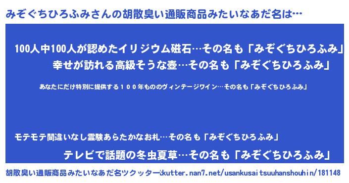 | 意味不明あだ名 | 『住所不定無職みぞぐちひろふみ(13歳)』 |