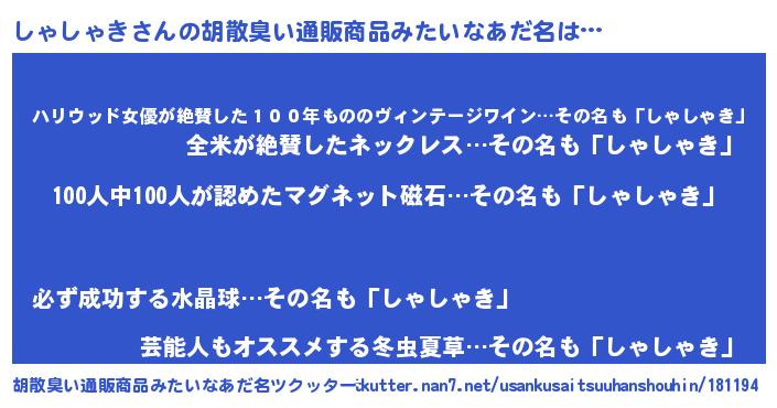 | ヘコむあだ名 | 『しゃ太郎』『しゃにー』『なまこ酢』 |