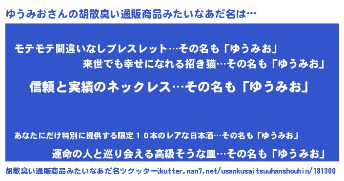 | 女子向けラノベタイトル風あだ名 | 『ゆうみおは平凡を望む』 |