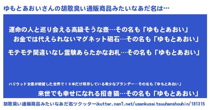 | 男性向けラノベタイトル風あだ名 | 『ユモトアオイアートオンライン』 |