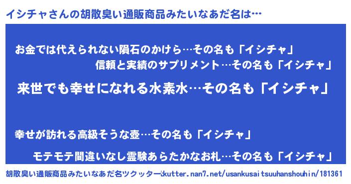 | 男性向けラノベタイトル風あだ名 | 『転生したらイシチャだった件』 |