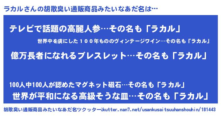 | 男性向けラノベタイトル風あだ名 | 『ラカル~年齢イコール彼女いない歴の魔法使い~』 |
