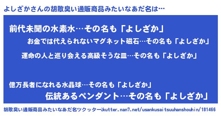 | ヒーロー風カッコイイあだ名 | 『ウルトラよしざかマン』『ネオヨシザカ』 |