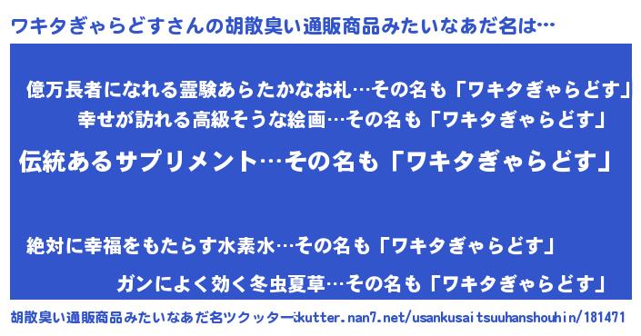 | 男性向けラノベタイトル風あだ名 | 『ワキタぎゃらどすの嫁は女の子じゃないと思った?』 |