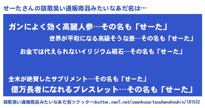 | 意味不明あだ名 | 『眠気覚ましガムせーた味』『自称せーた』 |