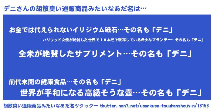 | 意味不明あだ名 | 『とにかく怪しいデニ』 |