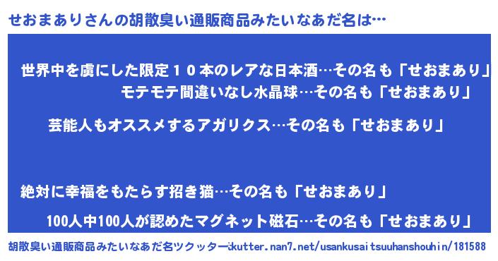 | ヘコむあだ名 | 『せおにゅー』『せおまあり(笑)』 |
