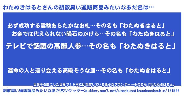| 恥ずかしいあだ名 | 『ワタヌキハルトデラックス』『わたちん』 |