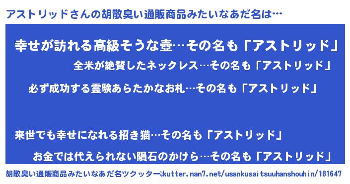 | 女子向けラノベタイトル風あだ名 | 『(仮)アストリッドのやんごとなき事情』 |