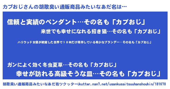 | 意味不明あだ名 | 『住所不定無職カブおじ(93歳)』 |