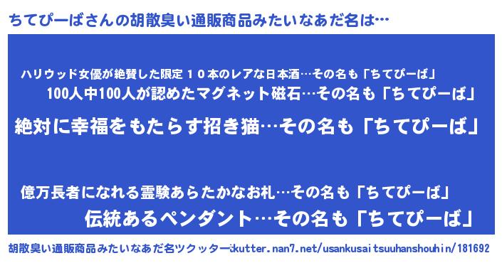 | 男性向けラノベタイトル風あだ名 | 『ちてぴーばという概念が存在しない退屈な世界 』 |