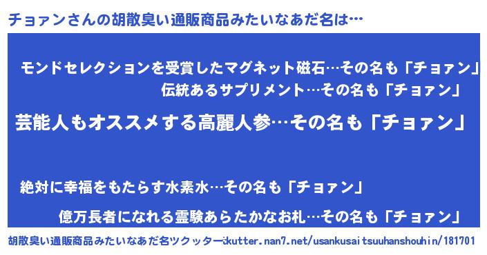 | 男性向けラノベタイトル風あだ名 | 『Re:チョァンから始める異世界生活』 |