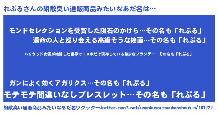 | 意味不明あだ名 | 『住所不定無職れぷる(98歳)』『自称れぷる』 |