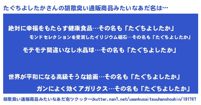 | ヘコむあだ名 | 『たぐにゅー』『たぐちよしたか(爆)』 |