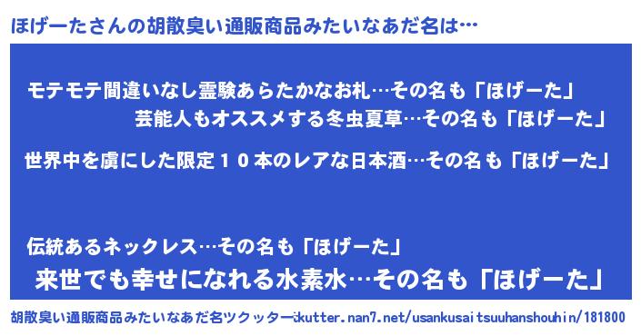 | 意味不明あだ名 | 『住所不定無職ほげーた(68歳)』 |