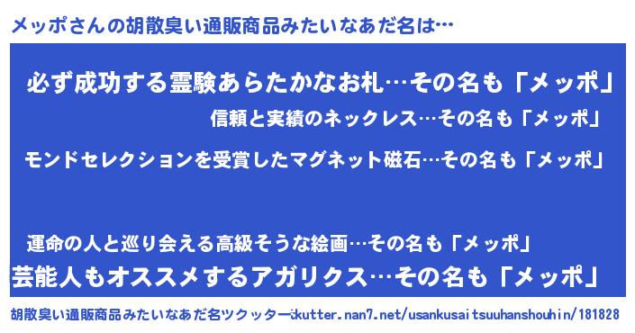 | ヒーロー風カッコイイあだ名 | 『天空の使者メッポ』『スーパーメッポ』 |