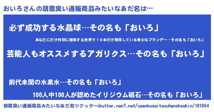 | 意味不明あだ名 | 『自称おいろ』『ペロリンおいろ』 |