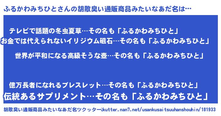 | 男性向けラノベタイトル風あだ名 | 『ふるかわみちひとに滅ぼされるだけの簡単なお仕事です』 |