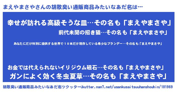 | 意味不明あだ名 | 『住所不定無職まえやまさや(95歳)』 |