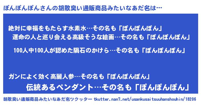 | 男性向けラノベタイトル風あだ名 | 『おまえをオタクにしてやるから、俺をぽんぽんぽんにしてくれ! 』 |