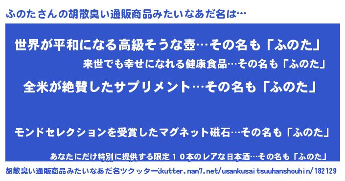 | 女子向けラノベタイトル風あだ名 | 『ふのた様がみてる』『ふのた伯爵の花嫁』 |