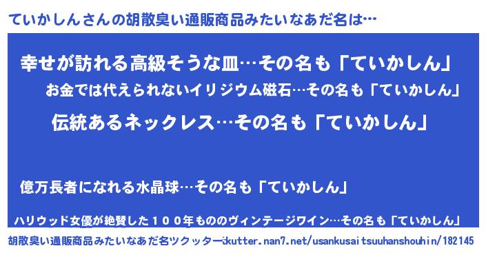 | 男性向けラノベタイトル風あだ名 | 『ていかしんに滅ぼされるだけの簡単なお仕事です』 |
