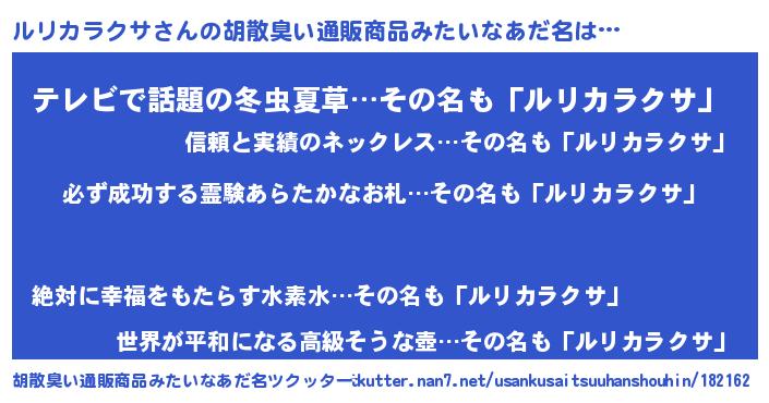 | 男性向けラノベタイトル風あだ名 | 『ルリカラクサの憂鬱』 |