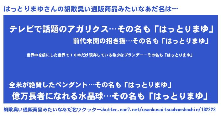 | 意味不明あだ名 | 『住所不定無職はっとりまゆ(89歳)』 |