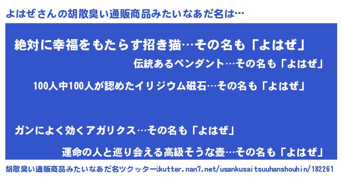 | 欧米人風あだ名 | 『トリンドルよはぜ』『ダニエルよはぜ』 |