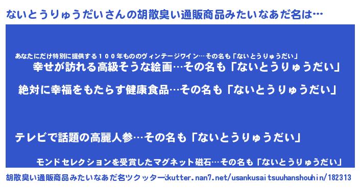| 男性向けラノベタイトル風あだ名 | 『ないとうりゅうだいという概念が存在しない退屈な世界 』 |