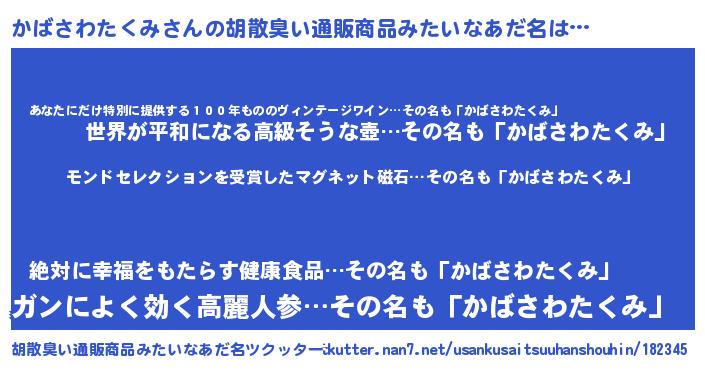 | ヘコむあだ名 | 『酢こんぶ』『かばさわたくみ(笑)』 |
