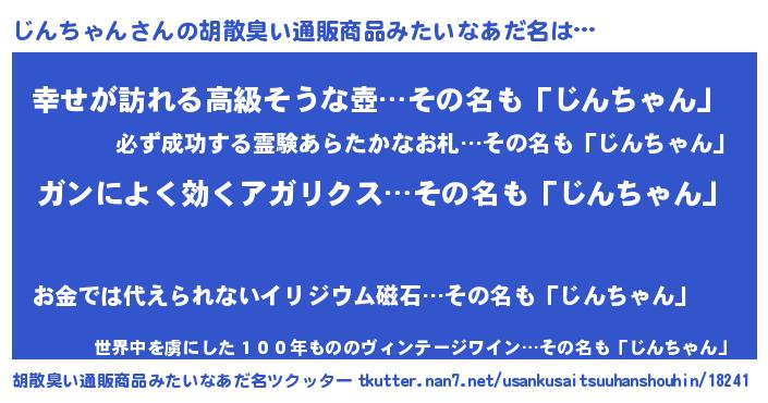 | 女子向けラノベタイトル風あだ名 | 『じんちゃんなんてお断りですっ。』 |