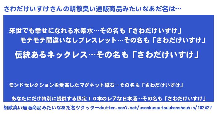 | 男性向けラノベタイトル風あだ名 | 『さわだけいすけの嫁は女の子じゃないと思った?』 |