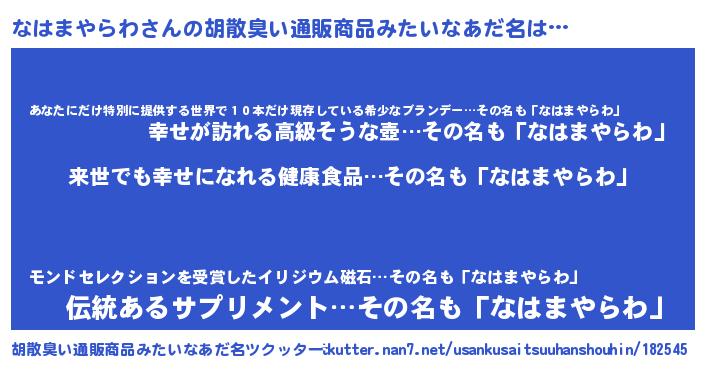 | 男性向けラノベタイトル風あだ名 | 『なはまやらわという概念が存在しない退屈な世界 』 |