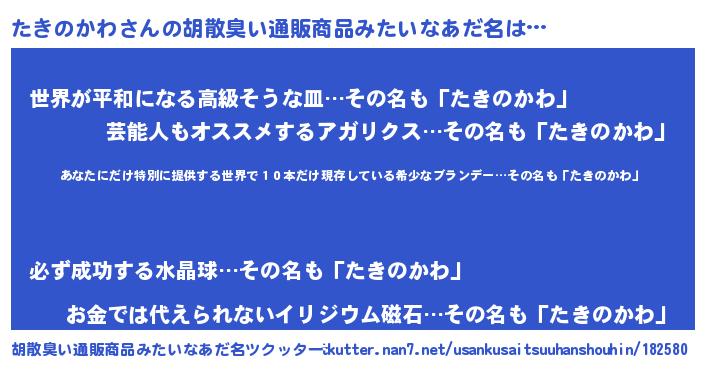 | 男性向けラノベタイトル風あだ名 | 『うちのたきのかわが世界を掌握している!』 |